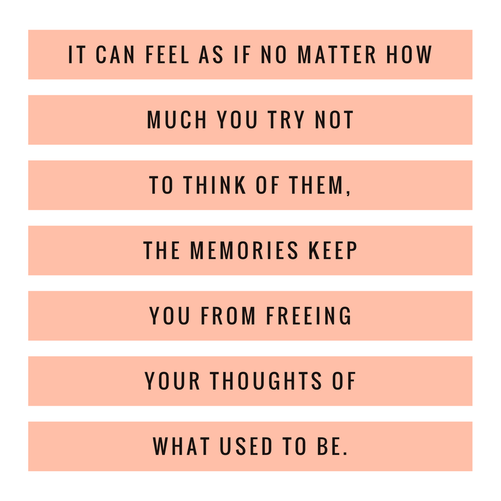 It can feel as if no matter how much you try not to think of them, the memories keep you from freeing your thoughts of what used to be. We can't "run" from the memories, so the question is, what do we do with them?
